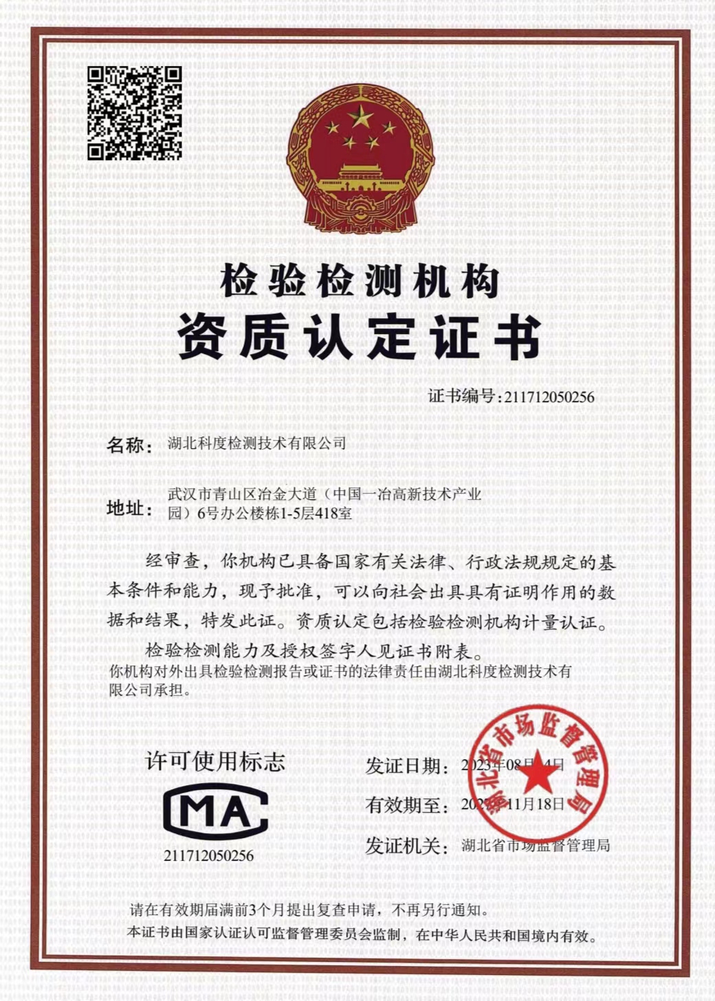 湖北科度檢測技術(shù)有限公司是一家專業(yè)從事環(huán)境類及相關(guān)領(lǐng)域檢測的第三方檢測機構(gòu),公司已通過湖北省市場監(jiān)督管理局CMA計量認證,可以面向社會出具權(quán)威CMA檢測報告。 我公司實驗室嚴格按照國家標準建設(shè),擁有一大批國內(nèi)外先進儀器設(shè)備及現(xiàn)代化配套設(shè)施,并有經(jīng)驗豐富的中高級專業(yè)技術(shù)人員和嚴格的實驗室質(zhì)量保證體系為項目運作提供強力支撐。 作為第三方檢測機構(gòu),公司始終以高度的社會責任感經(jīng)營企業(yè),以“公正、嚴謹、高效”為宗旨,依托專業(yè)的技術(shù)實力為客戶提供專業(yè)優(yōu)質(zhì)檢測服務(wù),受到政府、企業(yè)和社會各界的廣泛關(guān)注和認可。